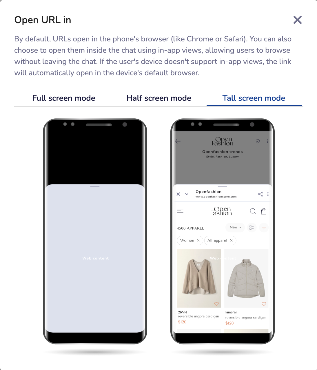 When adding a button or suggestion containing a URL, select the Webview mode and choose the view length (Compact / Medium / Tall) you want the end user to see.